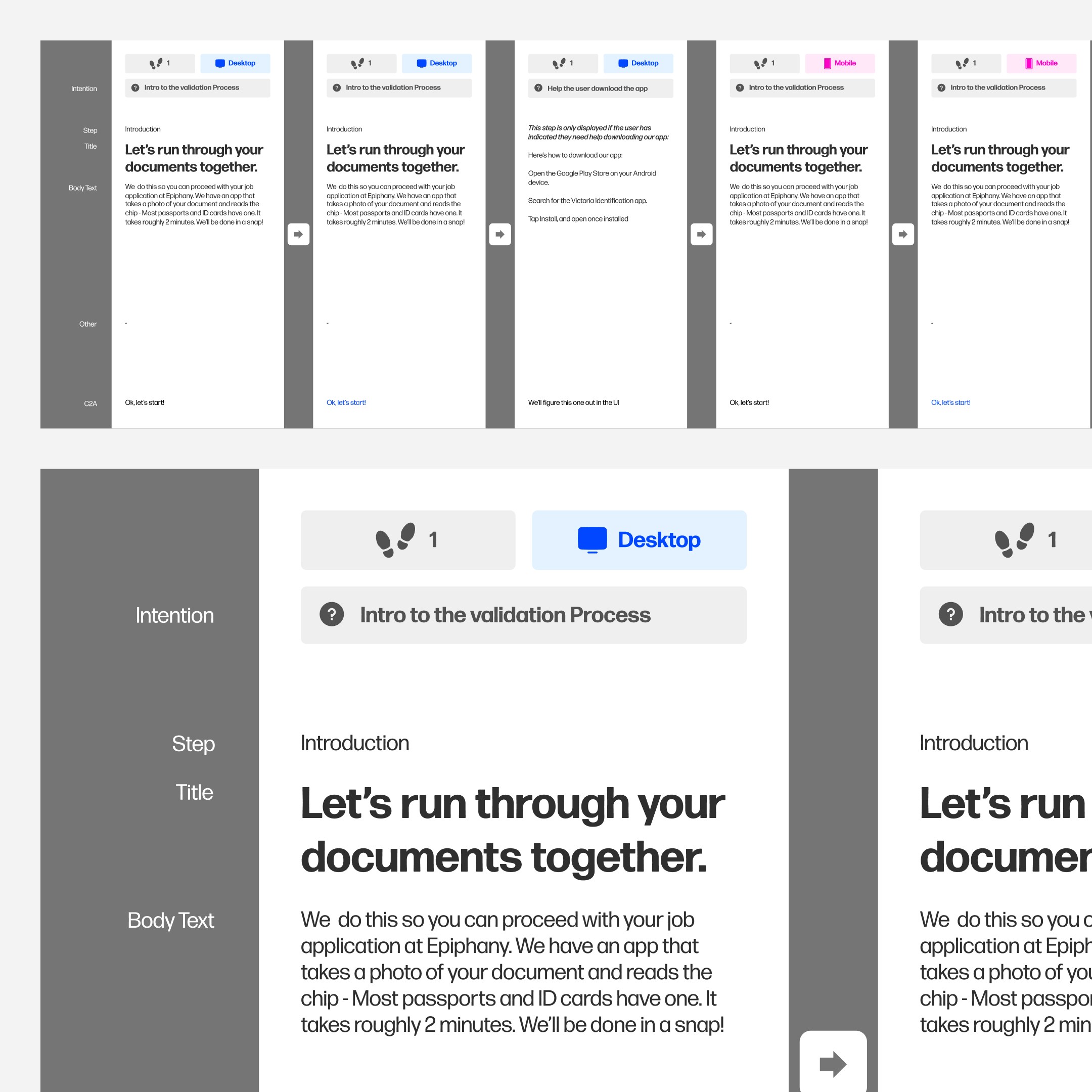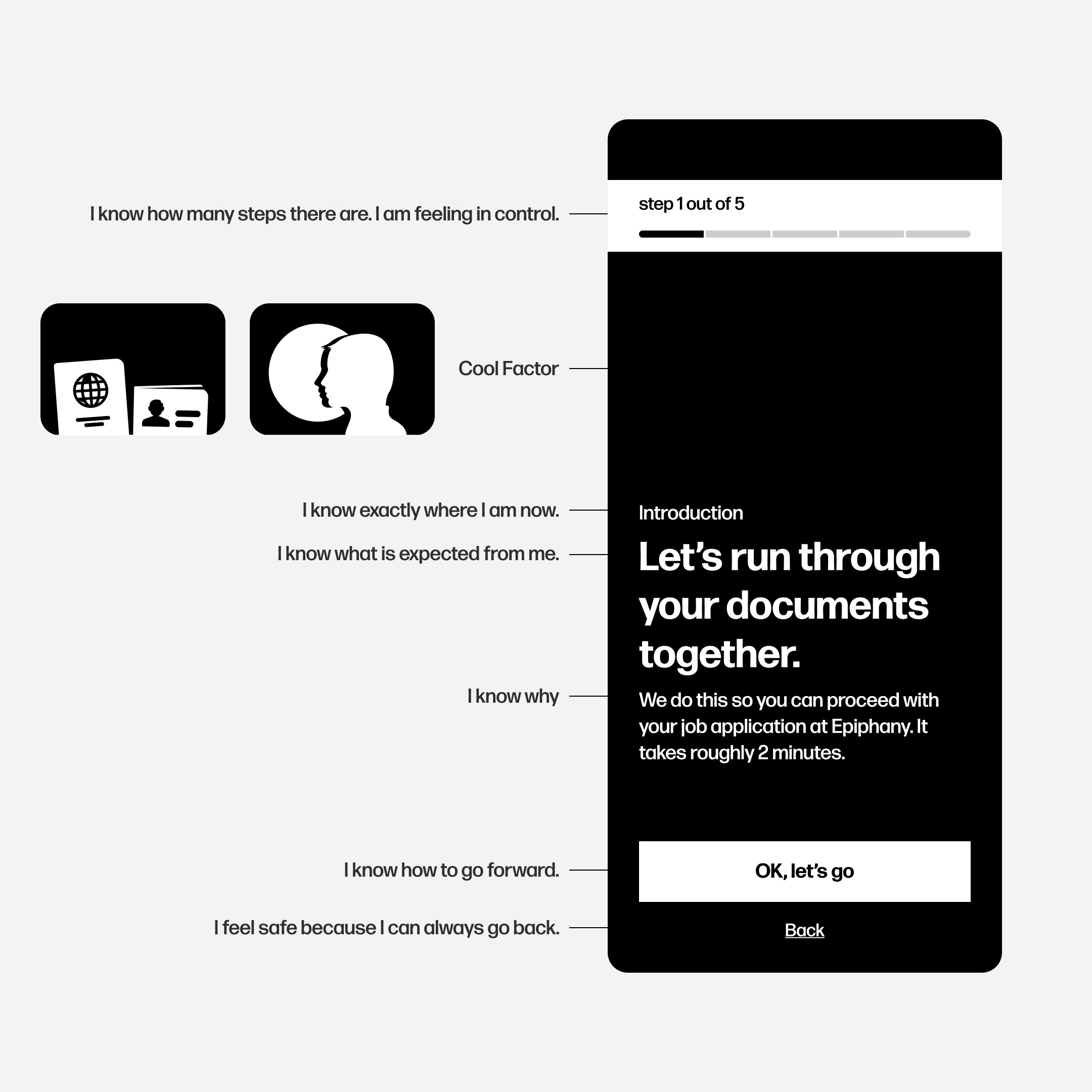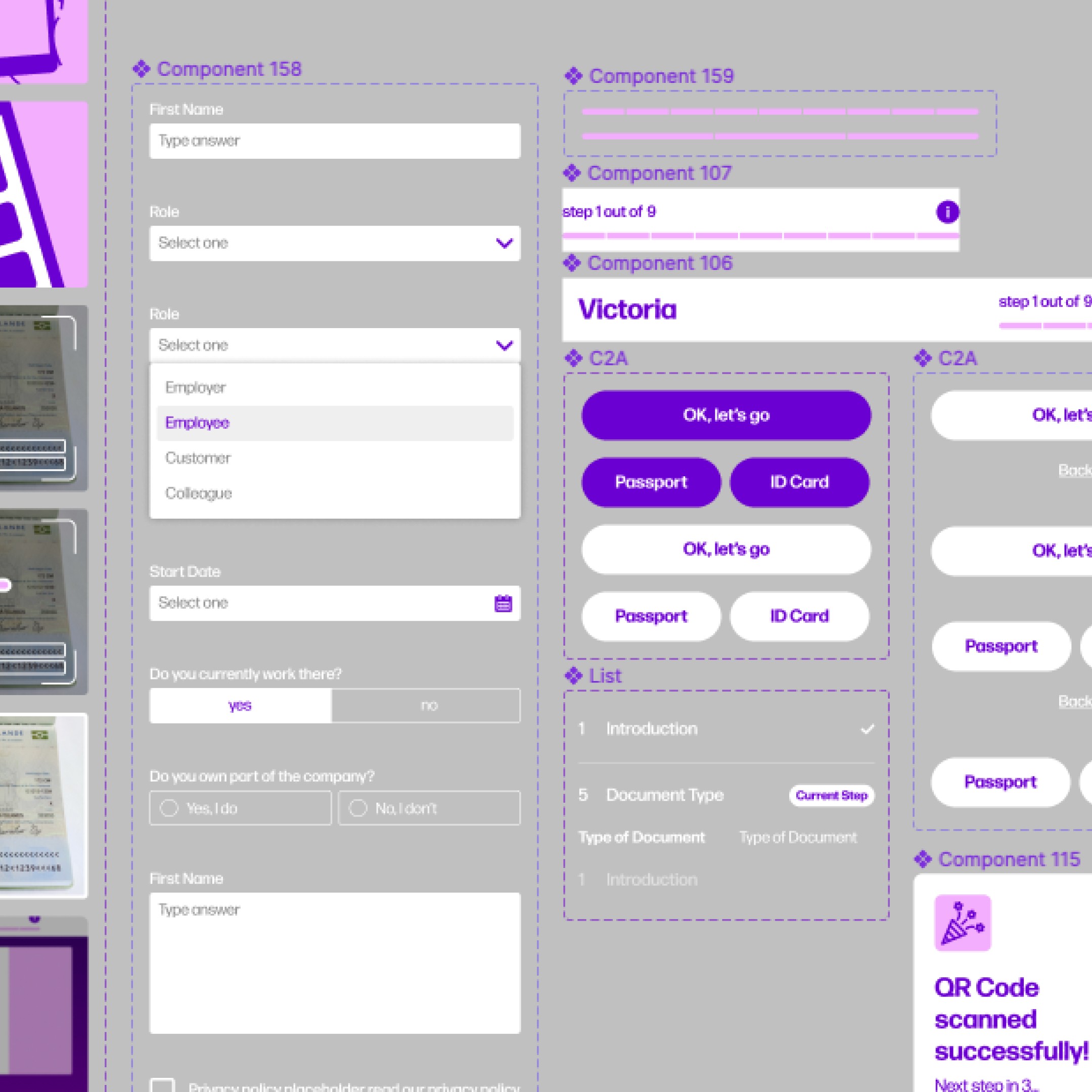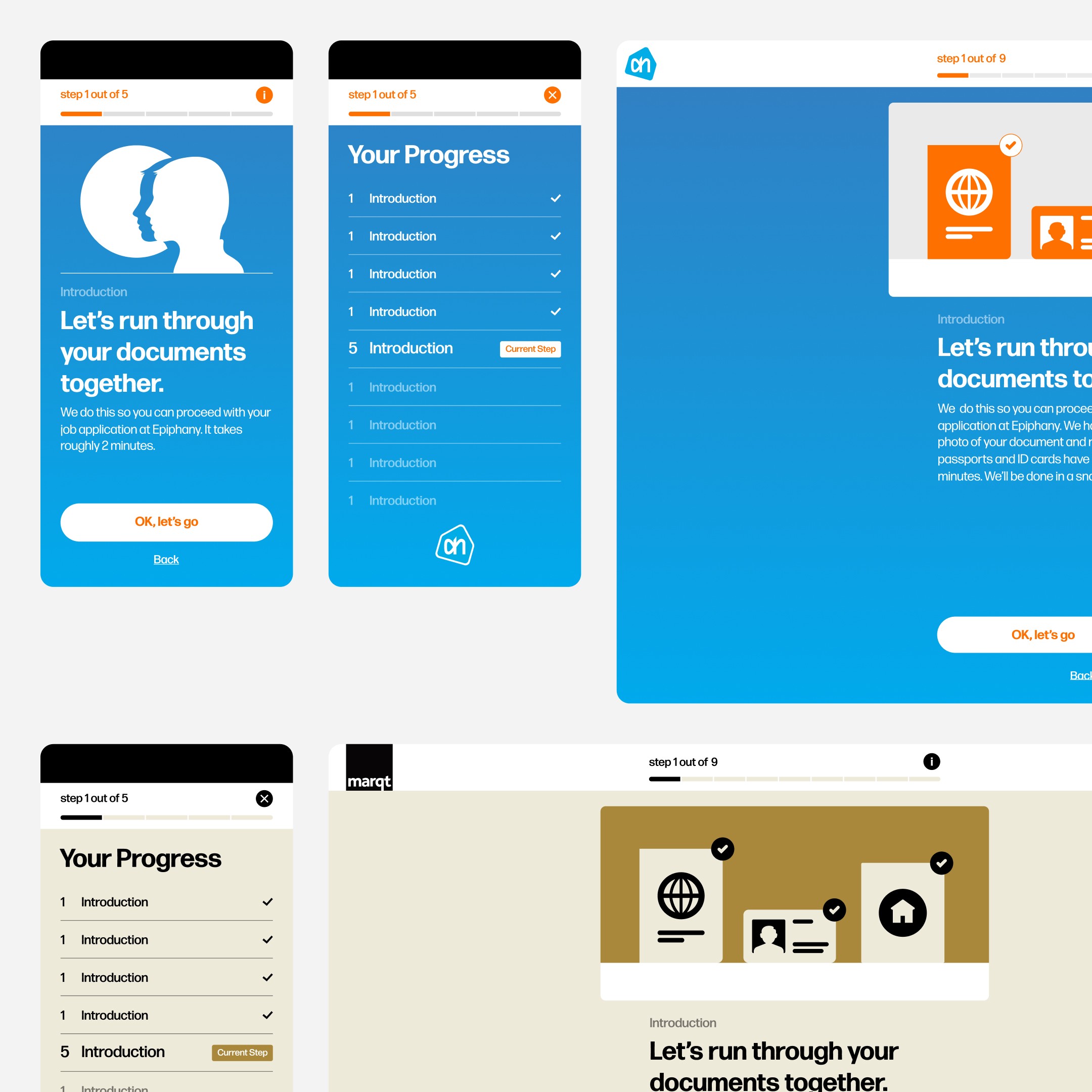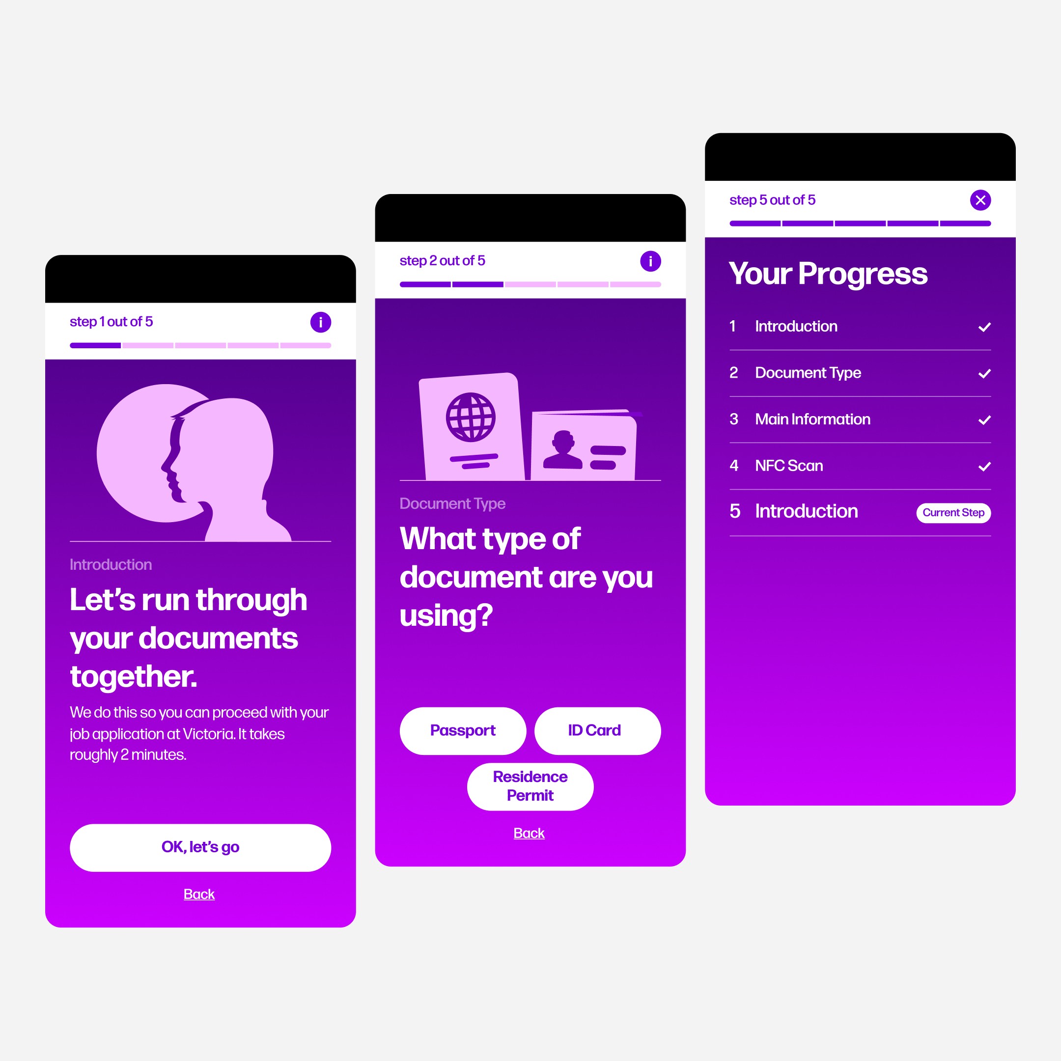 There was no existing product. We were starting at zero. This meant defining the experience model, the interaction patterns, the language, the emotional tone and the system logic. At the same time, the product needed to be white label, scalable and flexible enough to support many different types of identity checks both now and in the future.