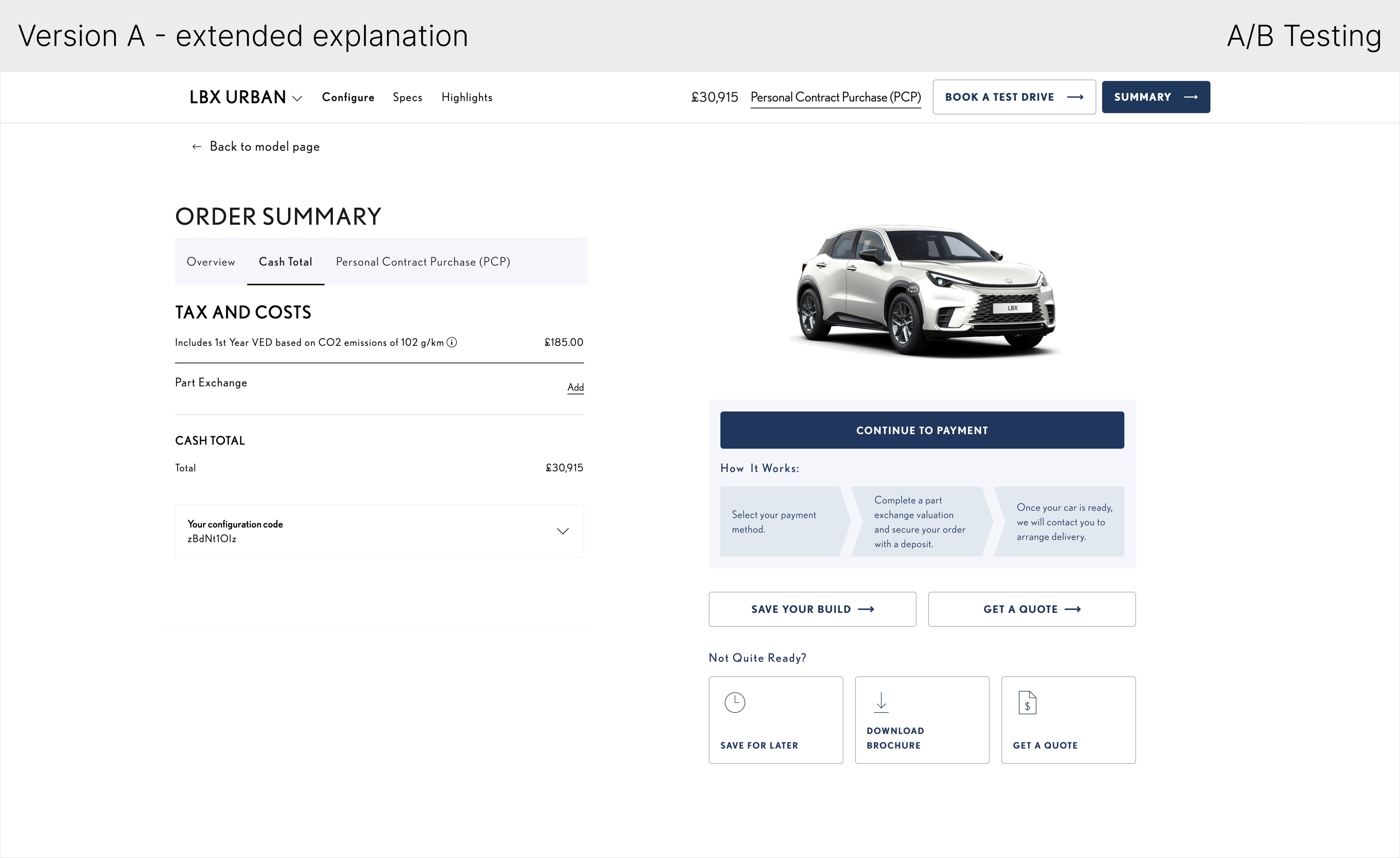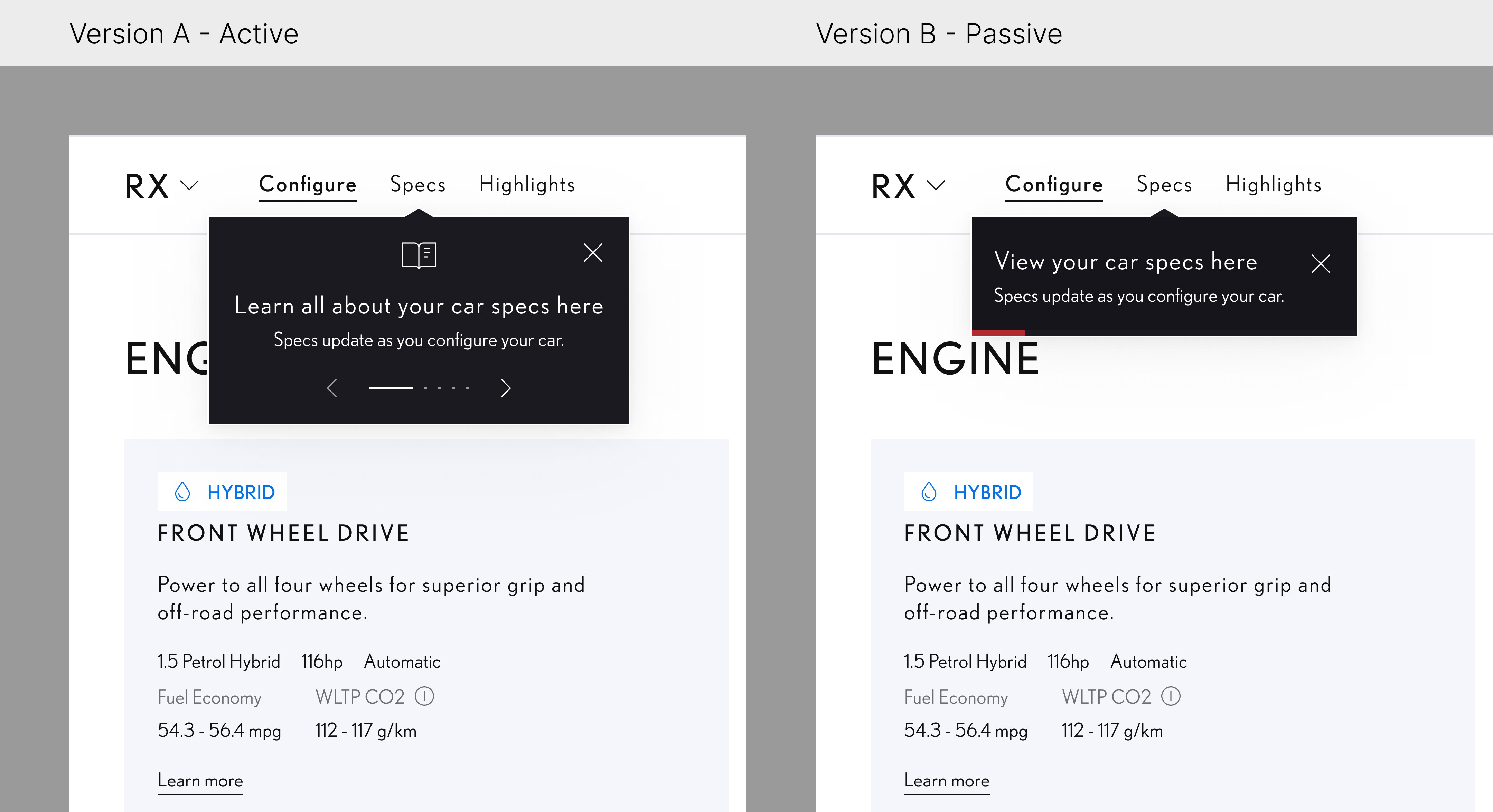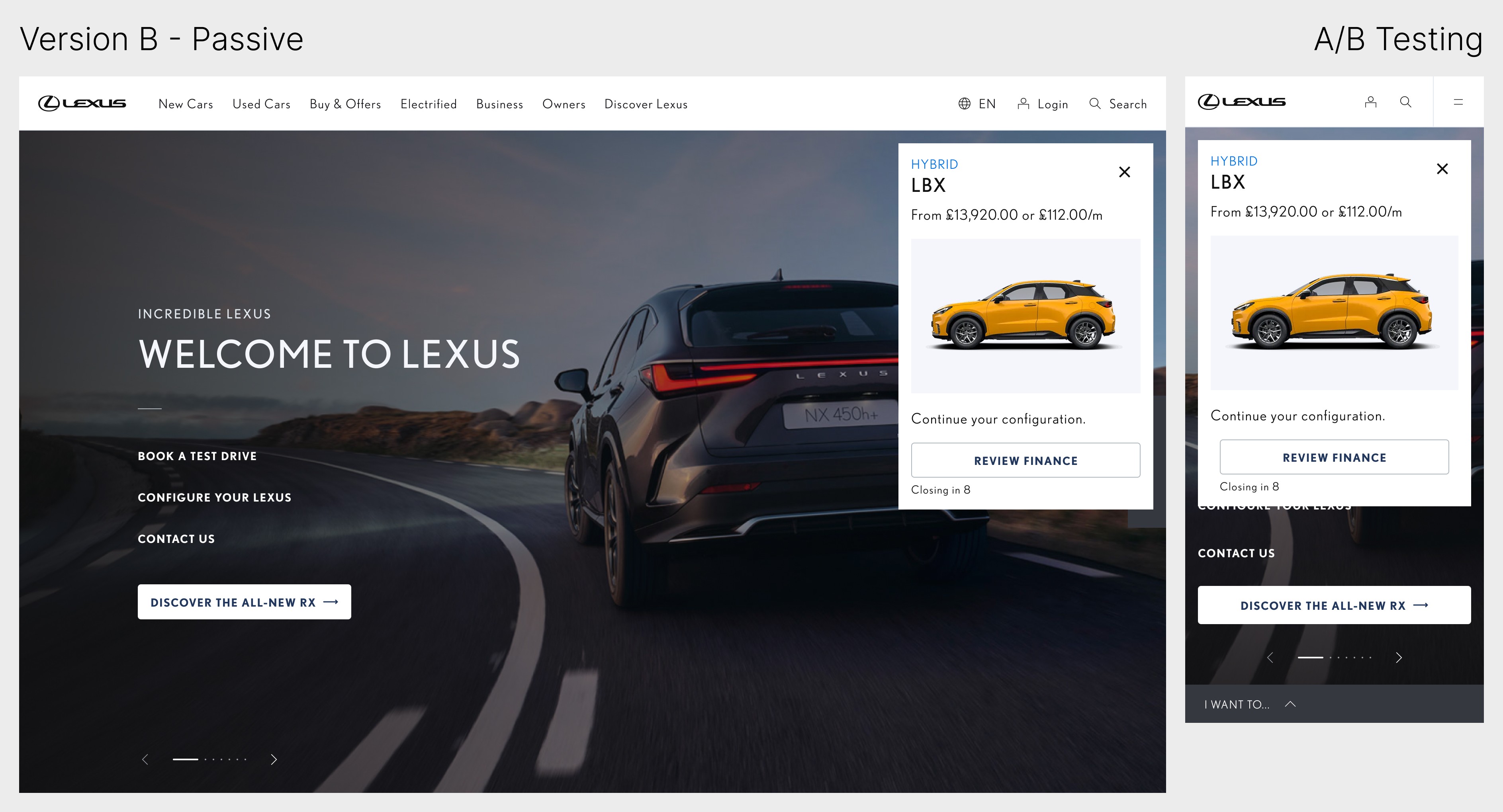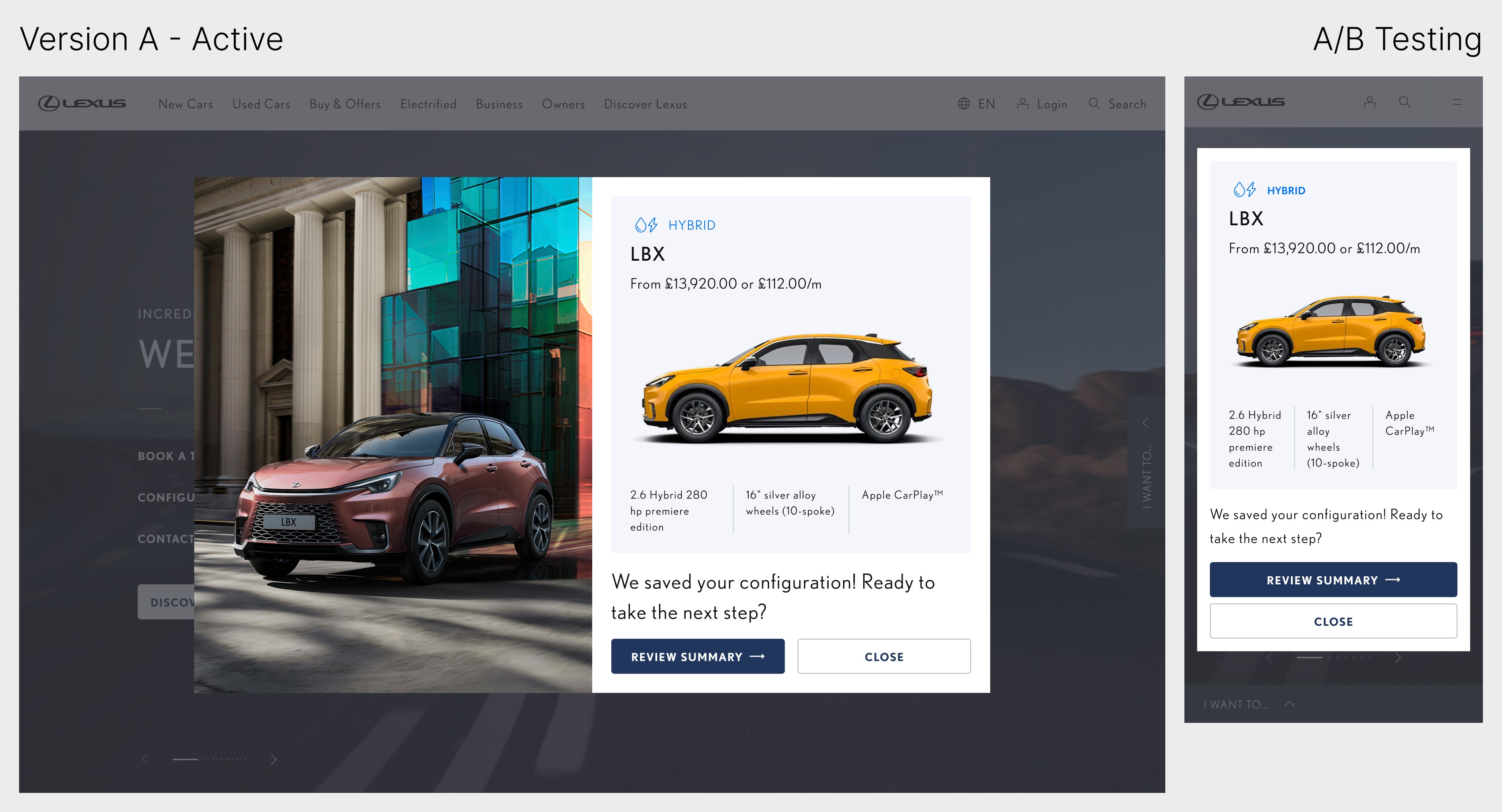 I worked as part of the Lexus Experimentation Team, a small group dedicated to improving the Lexus digital experience through continuous experimentation. Product managers from across Lexus Europe would bring us challenges, questions or opportunities. We designed, tested and evaluated solutions live on the site to see what worked and why. The focus was simple. Less guessing. More learning. And making sure every improvement actually benefits the people using the product.